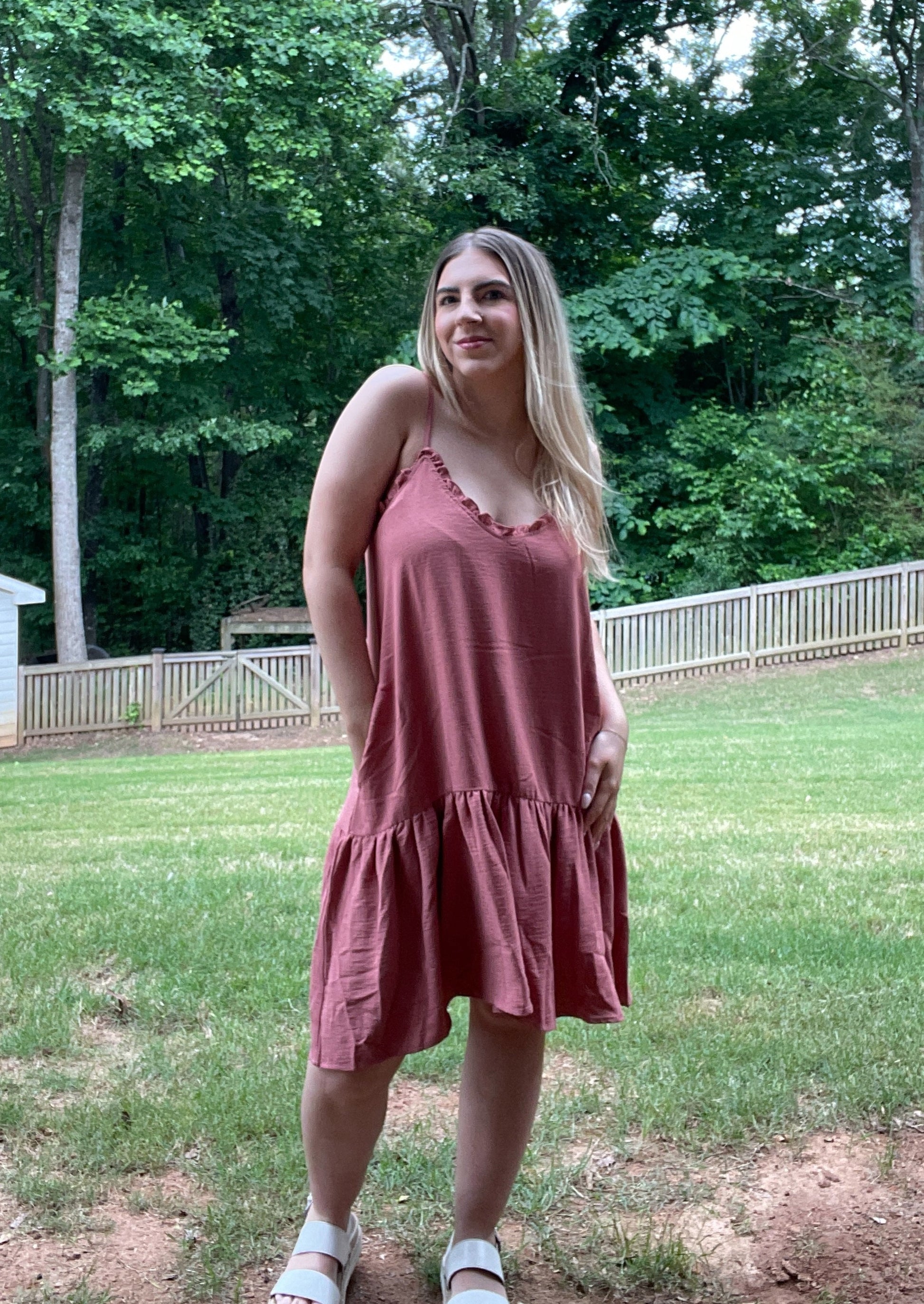 Go with the flow in our Ruffle Detail Mini Dress in ginger. The loose, flowy fit and playful ruffle detail make this dress a must-have for any occasion. No matter where you go, this dress will keep you looking stylish and feeling comfortable. (It's a win-win!)